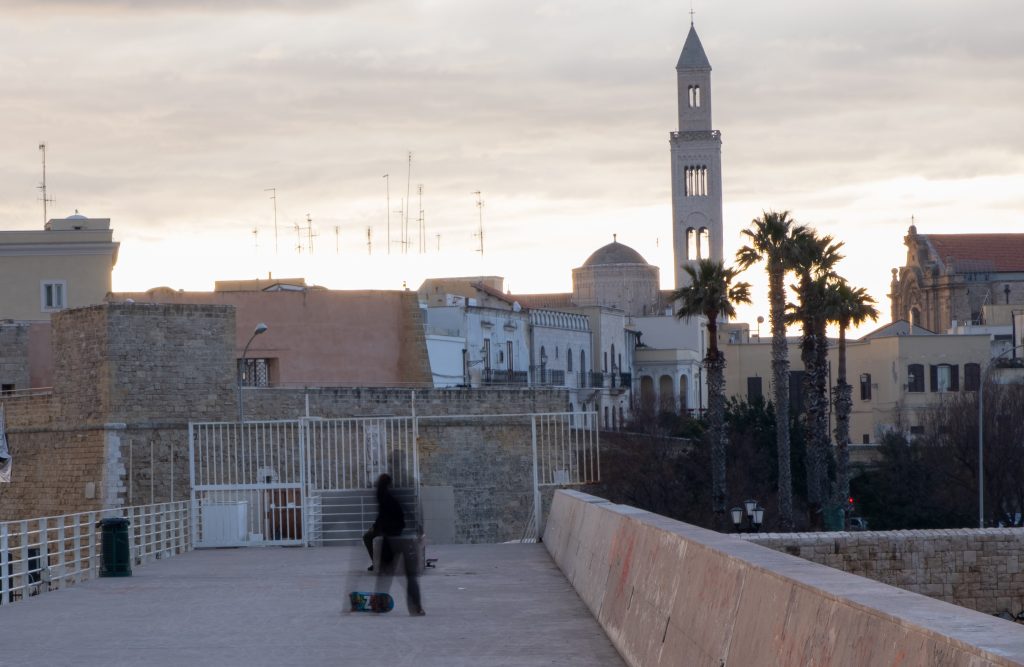 Skaters a Bari intenti ad acrobazie treck all’ombra del campanile della Cattedrale. Il tetto calpestabile del Molo Sant’Antonio di porto vecchio di Bari è habitat prediletto di giovani sportivi che vogliono praticare questo genere di attività acrobatiche.