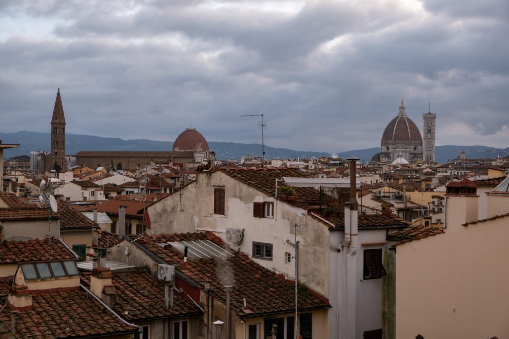 In questa giornata un po’ uggiosa tra i tetti di Firenze fa capolino la maestosa bellezza della Cupola del Brunelleschi di Santa Maria del Fiore. Le sue proporzioni auree e le sue dimensioni da record ci ricordano storia e importanza del Ducato fiorentino.