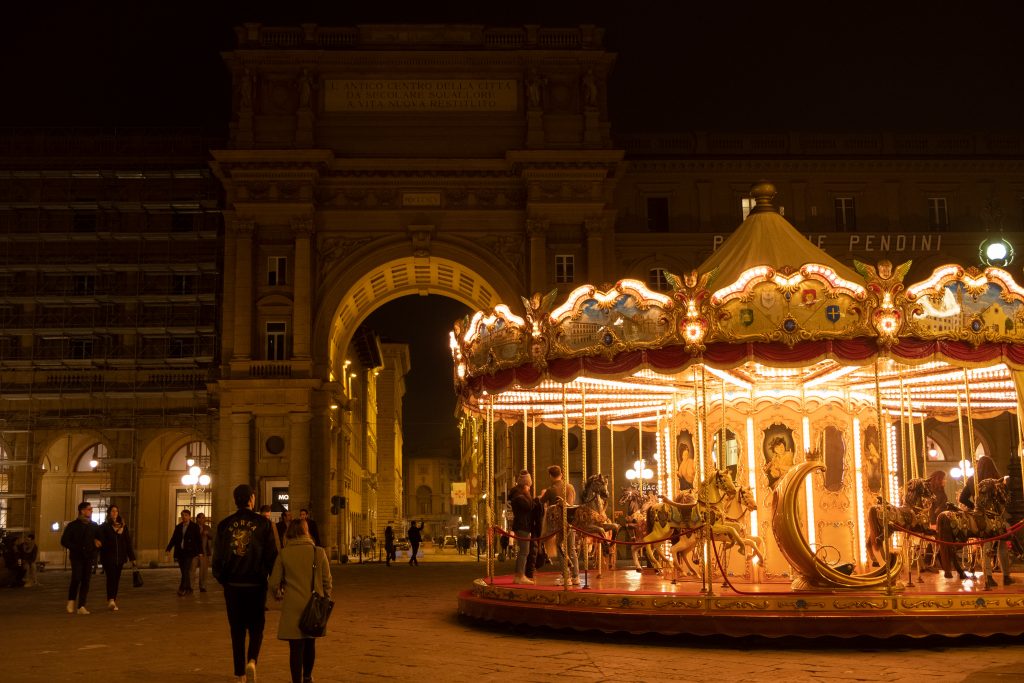 In Piazza della Repubblica a Firenze la Giostra Toscana storica in stile ‘700 rallegra da tanti anni bimbi e non solo. La dedizione della Famiglia Picci, gestore della struttura, permette di mantenere un decoro di altri tempi alla Piazza simbolo dell’esperienza di Firenze come Capitale d’Italia.