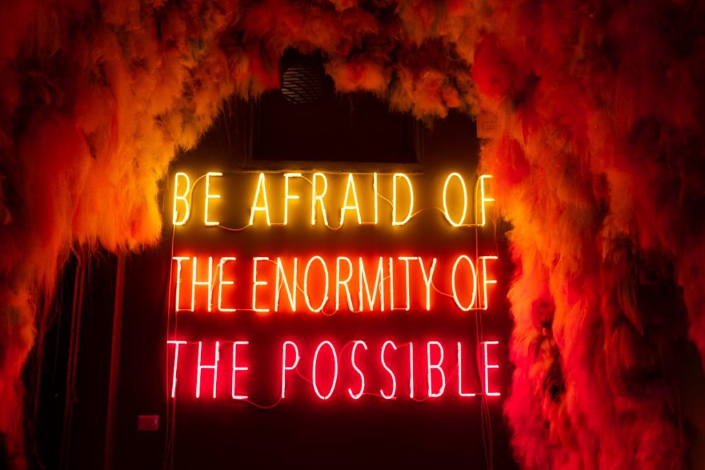 L’installazione a neon dell’Artista Alfredo Jaar dal titolo “Be Afraid of the enormity of the possible” in mostra al Chiostro del Bramante a Roma per la mostra Crazy – La follia nell’arte contemporanea. Abbi paura dell’enormità del possibile. Enormità, dice. Il vocabolario online della Treccani mette come definizione: essere enorme, smisurato, eccessivo. Possiamo mettere in conto, […]